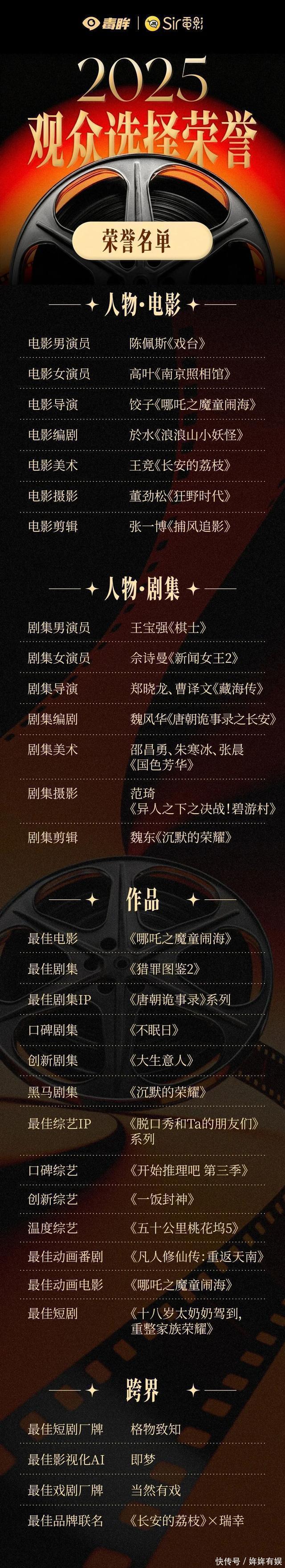 2025,很快就要成为过去式了。 这一年的电影票房也将要定格—— 512亿。 比起去年的425亿,算得上是顺利康复了。 这样的成绩,还是在《哪吒2》一己之力干出154.4亿票房,暑期档质量十年最佳的情况下完成的。 所以概括这一年—— 不乏爆款,但体感渐凉。 上周Sir已经说过了。 大盘,由大环境决定。 但作为观众,我们自己有自己的小生活,喜欢的电影还要继续看,这才是我们的选择。 所以今年,Sir希望让2025有好戏 「观众选择」 荣誉回归。 快速回顾一下规则。 提名名单仍由毒眸发起,联合有好戏矩阵(Sir电影、肉叔电影、柳飘飘了吗)编辑部投票产生,将这一年最值得喝彩的作品和人一网打尽。 包括电影,电视剧,综艺,甚至还有短剧。 经过上周各位评委的参与和见证,这份榜单终于出炉。